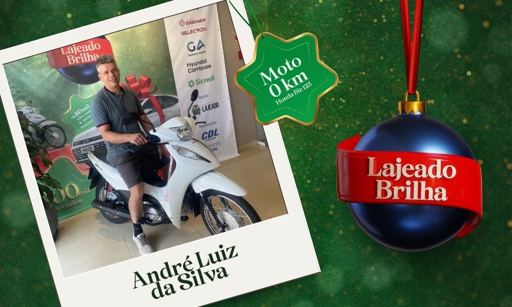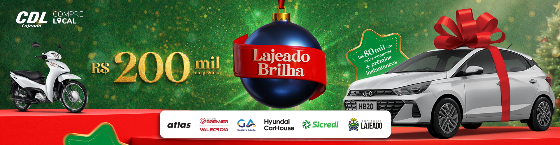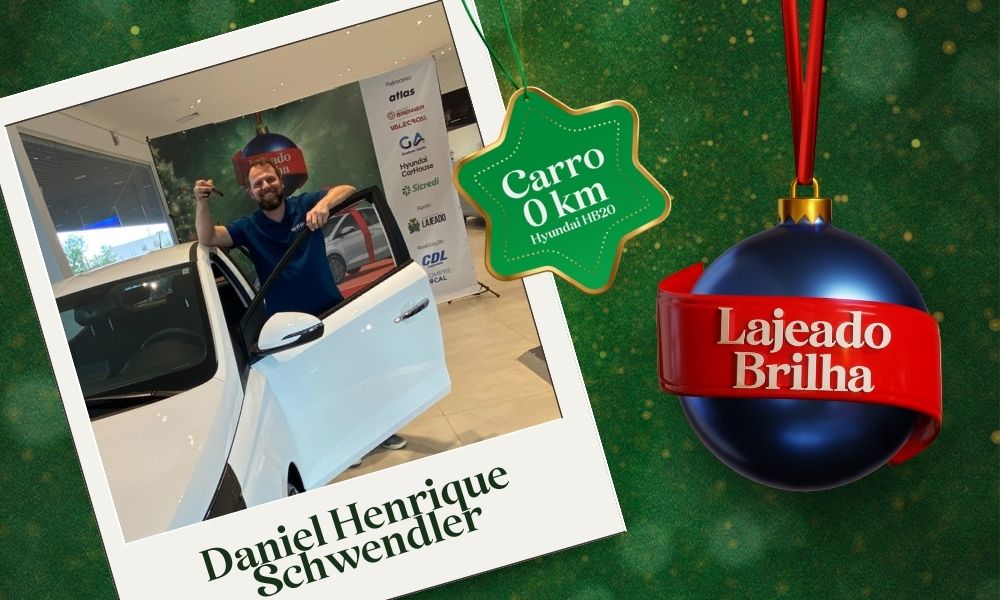 Maior campanha de estímulo às vendas promovida pela CDL Lajeado, o Lajeado Brilha 2025 iniciou no dia 17 de outubro e encerrou dia 24 de dezembro, distribuindo R$ 200 mil em premiação. O sorteio final ocorreu no dia 27 de dezembro, pela Loteria Federal, e contemplou Daniel Henrique Schwendler, de Lajeado e consumidor do Desco Atacado, com o Hyundai HB20; e André Luiz da Silva, de Nova Bréscia e cliente do ABC Lajeado, com a Honda Biz 125. A promoção teve ainda prêmios instantâneos e vales-compras de R$ 200,00 e R$ 400,00, valorizando os consumidores que fizeram suas compras no comércio local.